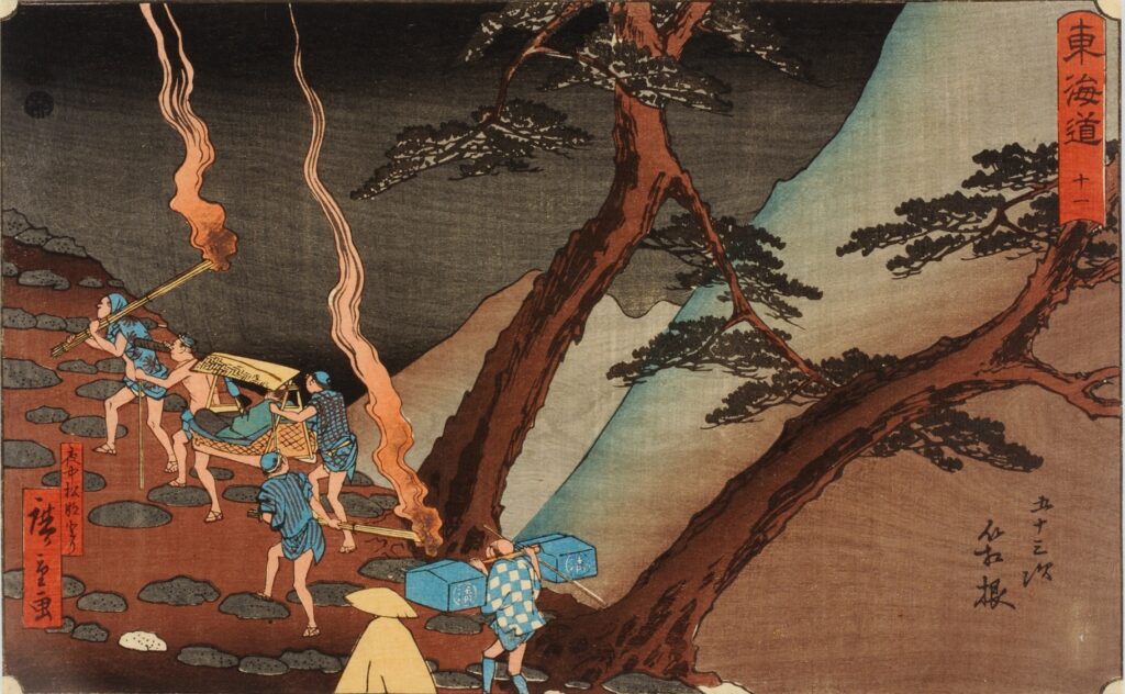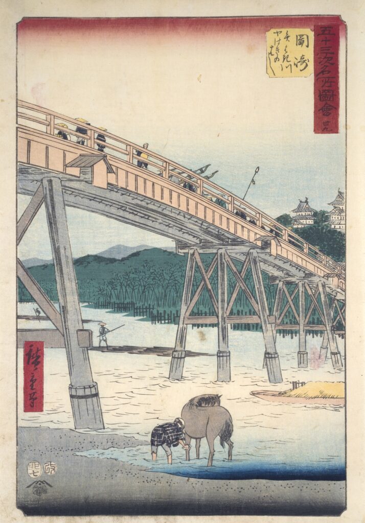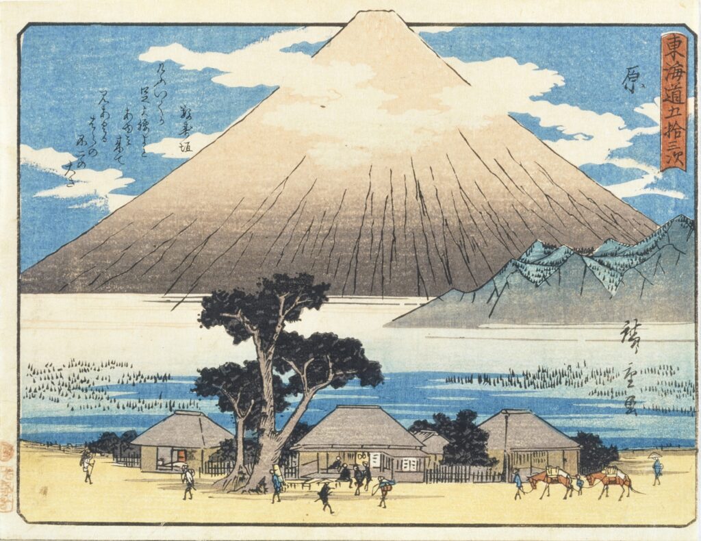 弘化4~嘉永5年(1847-52)に広重が手掛けた「東海道」は、作品名が隷書体で書かれていることから「隷書東海道」と通称されます。「東海道五拾三次之内」(通称、保永堂版東海道)の大ヒットから10年余りが経ち、画業の円熟期に入った広重による「保永堂版」の後継作品ともいえるシリーズです。景色を広角で捉えた構図と丁寧かつ鮮やかな摺り、街道を行き来するさまざまな人々の姿を通じて、東海道の旅路を魅力的に描き出しました。